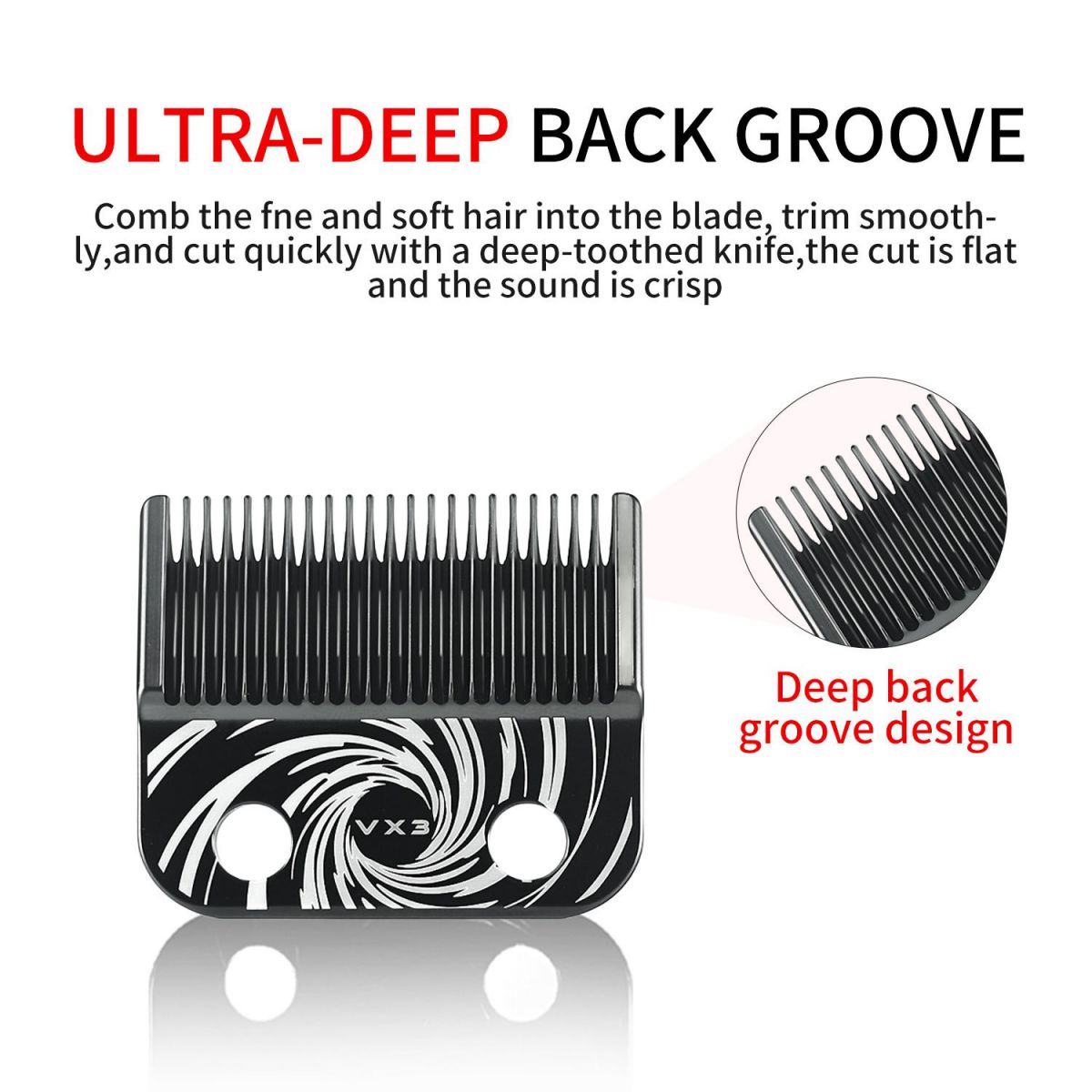 Thiết kế rãnh sau sâu giúp gom tóc hiệu quả, đặc biệt với tóc mảnh và tóc mềm. Hỗ trợ đưa tóc vào lưỡi nhanh hơn, đường cắt phẳng, đều và dứt khoát, giảm hiện tượng kẹt tóc.