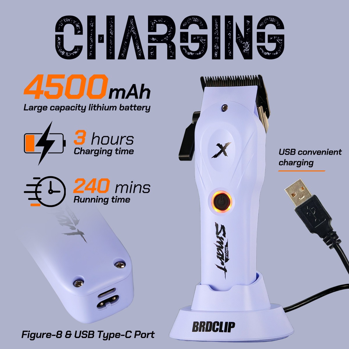 Dung lượng pin lớn 4500 mAh, sạc đầy trong 3 giờ, sử dụng liên tục 240 phút. Là lựa chọn lý tưởng cho thợ cắt tóc chuyên nghiệp.