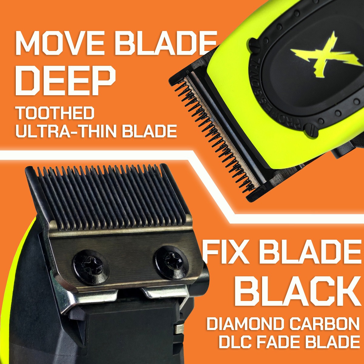Lưỡi di chuyển: Thiết kế răng sâu, siêu mỏng (Ultra-thin), hỗ trợ tối đa cho các kỹ thuật Fade, Taper và cắt sát da đầu mà không gây kích ứng.